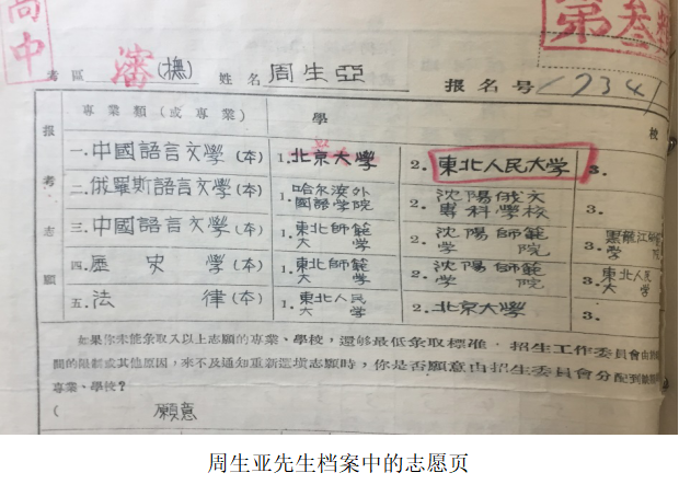 1951年,周先生以优异的成绩考入抚顺市一中。抚顺一中是重点中学,各县考生可以自由报考,后来在抚顺一中、抚顺二中的基础上抽调优秀师资,组建了“抚顺高中”,郭沫若先生亲自为学校题写了校名。1953年秋,周先生考入抚顺高中。在抚顺市一中学习的几年中,周先生的语文成绩很好,他的作文不但时而被作为范文在课上朗读,还在一次征文比赛中荣获二等奖,这使得中学时期的周先生萌生了一个“文学梦”——“我在高中的时候特别喜欢诗歌”,由此,周先生在文理分科中报考了文科班。另外,在中苏友好的大背景下,需要大量俄语人才投入国家建设,因此,周先生在高考中报考的几个志愿,就包括了中国语言文学和俄罗斯语言文学,饱含着对理想的追求和投身国家建设的热情