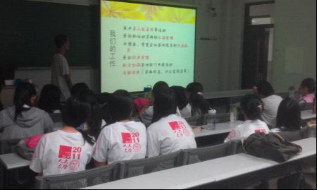 紧接着,青协外联部、宣传部、办公室、拓展部和项目部五个部门的负责人先后上台做招新演讲。他们活泼轻松的个人简介首先拉近了同新生的距离。他们利用幻灯片,图文并茂地向新生展示青协各部门的主要职能和部门特色,让新生对于青年志愿者协会这样一个服务社会,奉献爱心的部门有了清晰感性的认识。不仅如此,明园小学支教、探望孤寡老人等青协曾经举办过的经典活动以及青协在这些年来取得的成就更将有爱心、有能力、有梦想的文院青协人形象展现在新生们面前。