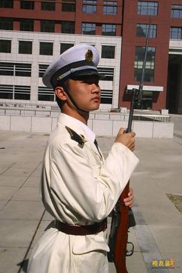 组建的海军方队,身穿白色海军服装,在2005年10月16日接受了中共中央政治局委员、国务委员、中央军委副主席兼国防部长曹刚川上将的检阅。