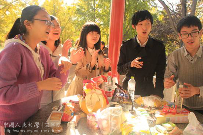 经过2小时的园内游览后,全班12点整准时回到了集合点,共享自备的午餐。午餐的过程中伴随着分享与交流,同学们从各地风光聊到生活兴趣,彼此间的了解亦渐渐加深。午饭后,各小组开始了集体游戏的时间。在持续三个小时的游戏时间中,在愉快的氛围中,大家不仅收获了游戏的欢乐,更增进了彼此间的友谊。下午3点整,同学们恋恋不舍地离开了陶然亭公园,2014级本科班秋游活动至此圆满结束。