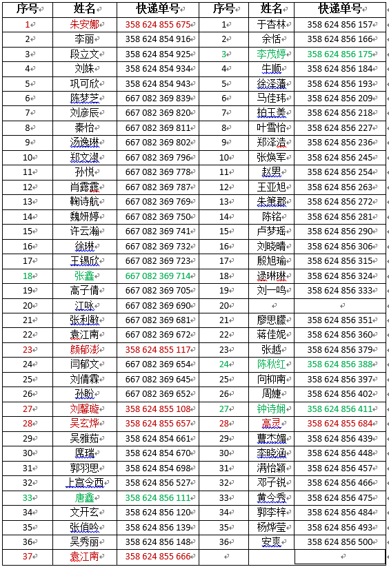 奈飞工厂 2018年拟录取学术型硕士研究生录取通知书已于2017年6月26日寄发,寄发邮件采用顺丰到付形式,寄发快递单号见下表格,请各位同学留意查看(红色标记为修改过地址的,绿色标记为未能拿到录取通知书的):