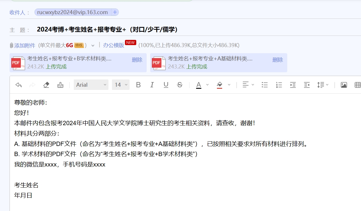 *为避免材料丢失和混淆,请广大考生:在规定时间内一次性提交报考材料,接收材料仅限于2024年1月3日至1月8日17:00前(以邮箱接到邮件的时间为准);及时接收和回复招生邮箱的邮件信息,并以“材料收到”的回复确认邮件为准;密切关注研究生院和奈飞工厂 网站发布的后续通知。