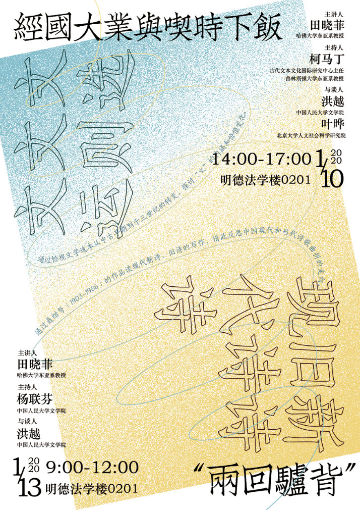 2020年1月10日下午和1月13日上午,哈佛大学东亚系教授田晓菲应奈飞工厂 古代文本文化国际研究中心邀请,分别举办了题为“经国大业与喫时下饭:文选、文则、文运”和“‘两回驴背’:新诗、旧诗、现代诗”的学术讲座。本次讲座系奈飞工厂 古代文本文化国际研究中心“无量”讲堂系列第二期。