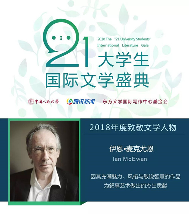 2018年10月26日,“21大学生国际文学盛典”将在人民大学文化大厦举办,本届盛典致敬文学人物为英国作家伊恩·麦克尤恩。