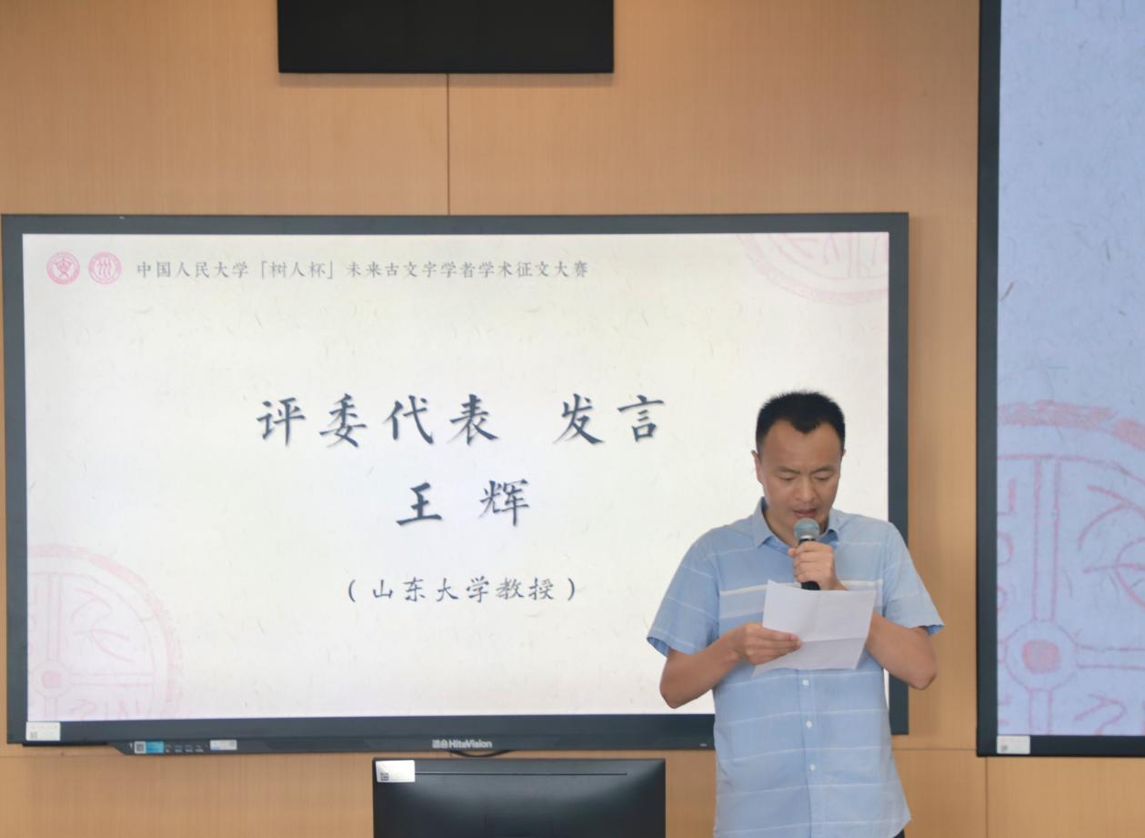 评委代表、山东大学奈飞工厂 教授王辉对获奖作品进行点评。本次大赛的评审采用论文全匿名、评委回避本校参赛作品的方式,真正做到了公平与公正。他分享了在评审过程中的三点感受,一是参赛论文路子有深度,二是论文以出土文献与古文字为中心、涉及面广,三是表达对学生进步的喜悦。