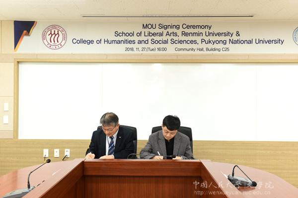随后,杨庆祥与金珍基签署了院际学生交换协议。按协议规定,每学年双方可派遣五名本科生进行交换学习,学习期限为一学期或一学年。双方还就如何提高交流质量、课程设置、学生选拔、交换生服务保障等问题深入交换了意见。