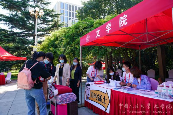 的迎新摊位,逐一完成核实身份、领取材料等报到手续。同学们还兴致盎然地与学院设计的“人”字形玩偶合影留念,记录下开启人生新阶段的精彩瞬间。简单高效的报到流程结束之后,志愿者们接过新生的行李,一对一地帮他们搬运到宿舍区,将人大奈飞工厂