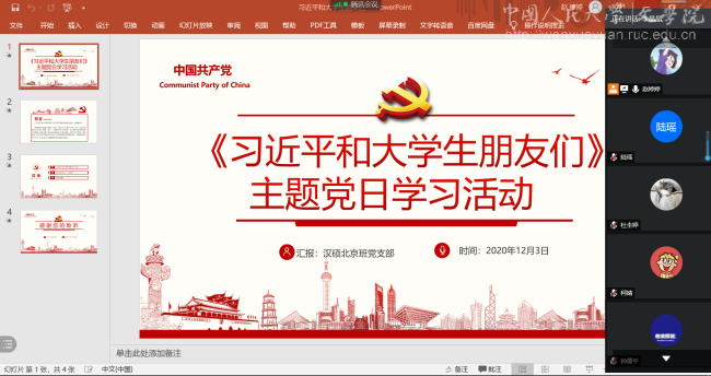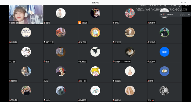 汉语国际教育硕士北京班以线上形式,围绕《习近平与大学生朋友们》一书展开主题学习活动。党支部书记赵婷婷先对此书做了大致介绍,围绕“解决矛盾、敢于斗争”问题分享了自己的感悟。其他党员同学也各抒己见,如钟儒平同学用两个“工作”概括自己的学习感悟,分别是党建工作和基层工作,并就这两个“工作”展开具体分析,如推动校园党建来引领青年一代的发展等。2019级汉语国际教育硕士一班也在线上开展《习近平与大学生朋友们》共享读书会。会上由班级班长、党支书、团支书、研会主席等八名同学,就基层工作、学生工作经验、乡村调研经历、海外孔子学院教学经历、抗疫经历等实际工作,结合具体章节分享自己的感悟与体会。