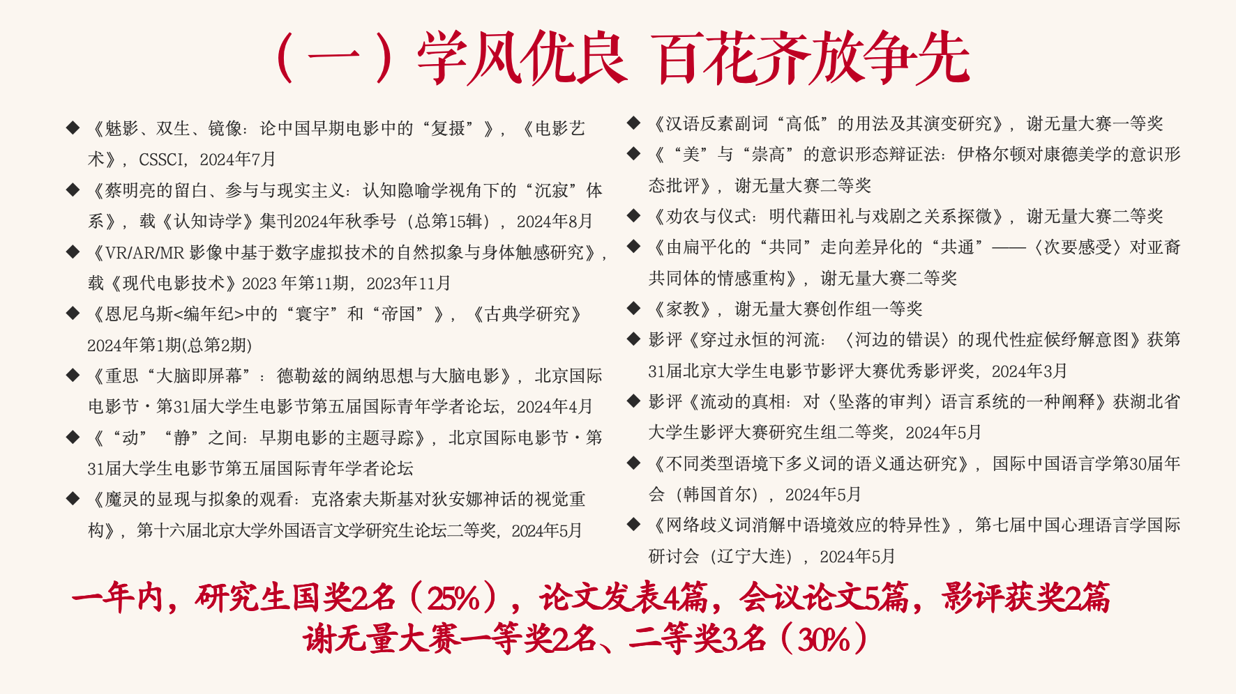 班级同学秉持追求真理的信念,自觉接受严格的学术训练,在各自专业领域取得了优异的成绩。王涵玉、方乐雅2名同学获国家奖学金,占学院硕士国奖名额的25%。班级同学在《电影艺术》《认知诗学》《古典学研究》等刊物上发表了4篇高质量论文,展现了专业素养与学术深度。我班在奈飞工厂 谢无量大赛中斩获2个一等奖和3个二等奖,占硕博组获奖人数近30%。此外,班级同学还发声于北京国际电影节·第31届大学生电影节第五届国际青年学者论坛、国际中国语言学第30届年会、中国心理语言学国际研讨会、北京大学外国语言文学研究生论坛等学术论坛。
