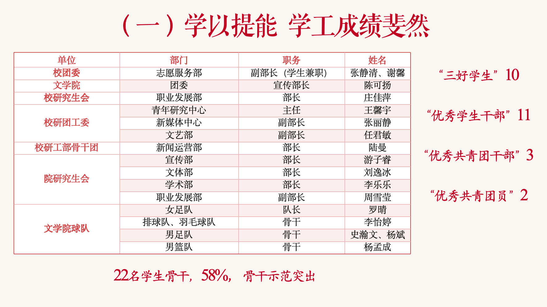 班内学生领导力、组织力突出,22名同学活跃在校院两级学生组织、担任党团班骨干,占班级总人数的58%。获“三好学生”“优秀共青团干部”等荣誉称号26人次。