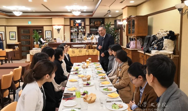 师生准备了简单而热烈的欢迎晚宴。朱万曙教授在致辞中提到,日本有两点很触动他,一是文明,人们在生活中自觉遵守规则;二是东大学生的勤奋好学,学生们几乎都能用中文流利地和中国学生交流和提问。朱老师还提到,所谓“教养”,是指高等学府不仅要教授学生知识,也要培养学生为人处世的修养。之后,石井刚老师做了简短的发言,代表学院欢迎大家的到来,并表示以后将延续并拓展两校的交流活动。