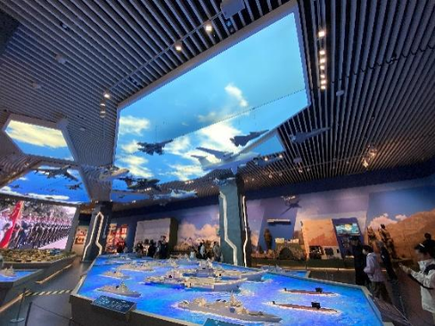 随后,同学们走进“新时代国防和军队建设成就展”,歼-20战斗机模型、山东舰航母模型等展品前人头攒动。大家驻足凝视,认真聆听讲解,详细了解我国在隐身战机、航空母舰、新型导弹等领域的突破成果,当得知这些装备均为自主研发、达到世界先进水平时,现场响起阵阵赞叹,自豪感与使命感在同学们心中油然而生。