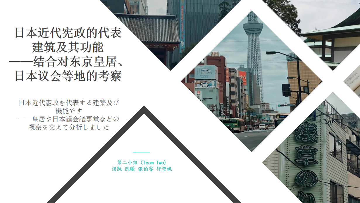 第二小组的汇报主题为“日本近代宪政的代表建筑及其功能——结合对东京皇居、日本议会等地的考察”。该组同学首先分享了自己在漫步于东京街头的所见所感,将东京与北京这两座国际化大都市做了街道安排、城市风格等方面的对比,并对在神保町旧书收集到的日文论著与资料做了基本介绍。