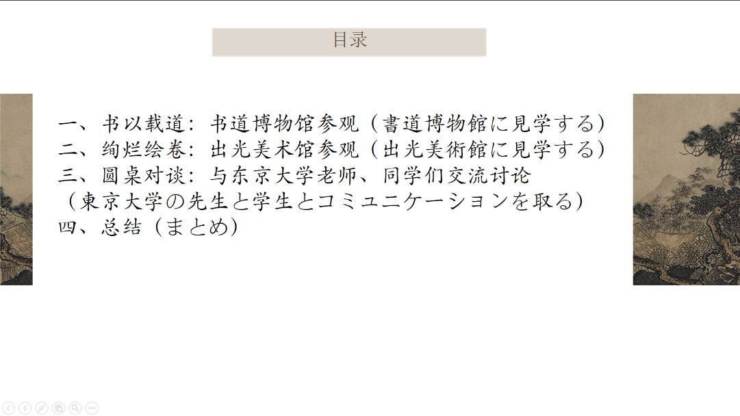 该组认为,古代的日本文化很大程度上受到中国文化风格的影响,在文献观念、文字形态以及书写规范等方面有明显的中国古典风格痕迹,但日本文化也有其独到的创新之处。例如,出光美术馆收藏的琳派绘画作品在继承中国山水画水墨风格的同时也加入了日本本土和歌元素,让江户时代的艺术焕发出新的活力。中日两国的文化观念在学术研究上也存在差异,中国学界注重经典的研究和传承,强调对古代文献的释读和理解;而日本学界重视对古代文献的考古学和历史学研究,常常对材料的工具化使用。例如大西老师在分享中提及,他意识到研究上古汉语语法的学者所依据的传世文献并不一定能反映先秦的真正语言面貌,因此需要用出土文献上古文字的材料去补充,自己也因而走上了古文字研究的道路。此外,东京大学同学们选择学习汉语、认知中国文化的分享也让调研组认识到,通过举办中日研究成果分享会、文化展览等活动,可以加强中日两国的学术交流与合作、推动跨文化研究,实现更深刻的文化互鉴。