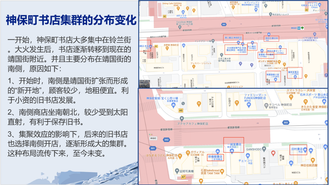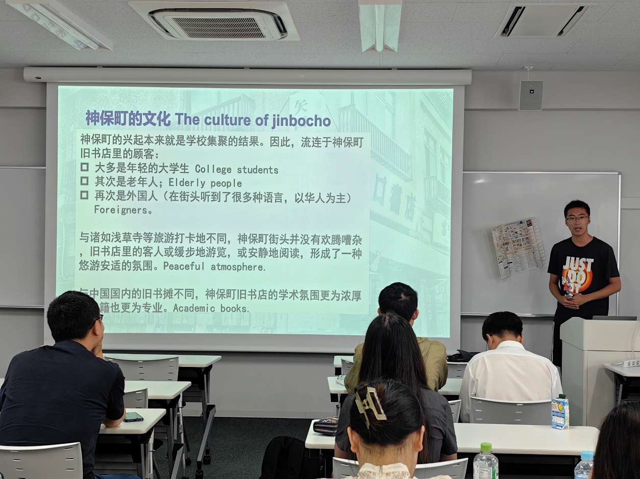 第四小组则将目光聚焦于神保町旧书街,以“神保町旧书街发展历程以及中日二手书交易对比”为主题进行分享。该组首先回顾了神保町旧书街的发展历程。神保町古书街,位于日本东京都千代田区神田神保町,是日本乃至于全球最大的旧书店街,有“旧书的圣地”之称。神保町古书街的店家数约200家,其中约110家是旧书店,约占东京都内旧书店总数的三分之一。该组成员并结合路上观察的感受,认为日本旧书街发展繁荣的原因主要有如下几点:第一,日本新书成本高,导致旧书需求旺盛。第二,学科需要特定版本的古书,只能通过旧书市场获取。第三,绝版书只能在旧书市场找到,如珍贵古籍和高级旧书。第四,常用二手教材供学生选择,附近高校学生为主要顾客。第五,阅读旧书符合现代环保观念,节能减排。