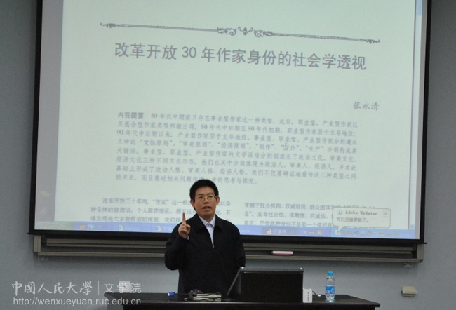 张永青教授以新颖的观点、详实的例证以及幽默的语言阐释了在改革开放30年的大时代背景下作家身份在体制内与体制外存在的问题,作家身份的逐步演化及其选择与辨别的复杂性等一系列问题,使同学们对作家、作品与时代的关系有了更深入的了解,对当今社会的文化现象有了更深刻的思考。