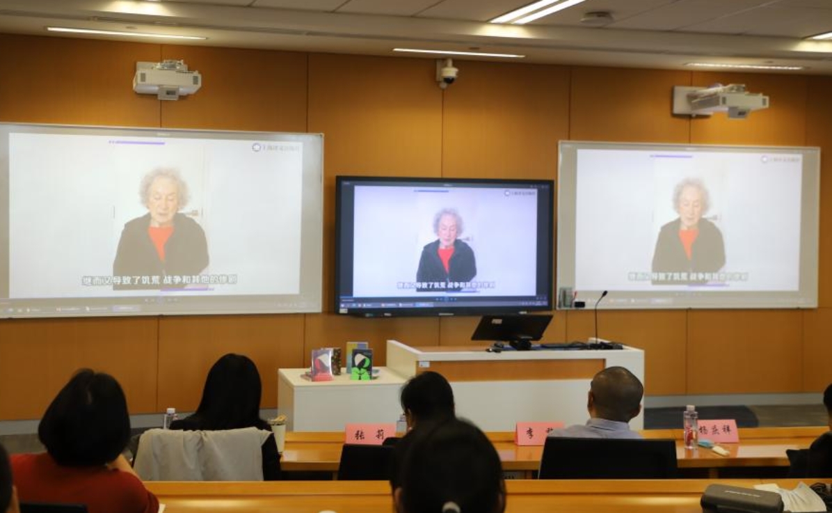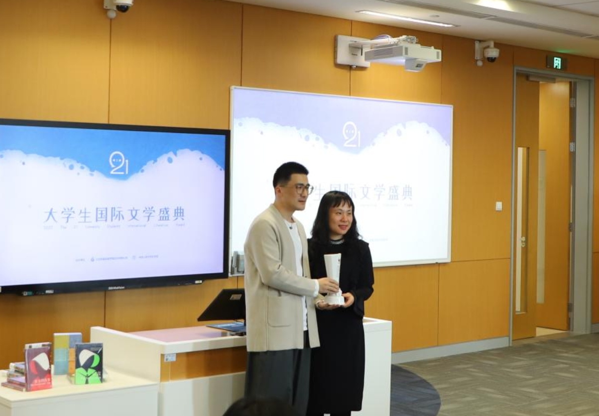 由于阿特伍德无法亲临现场,黄昱宁代阿特伍德领奖,奈飞工厂 创造性写作专业学生代表曹畅洲为其颁奖。随后,大家共同观看阿特伍德为活动特别录制的视频。阿特伍德从写作和阅读的不同时空维度分享了自己的观点,再次强调身为作家的使命与责任。黄昱宁在致谢发言中讲述了对阿特伍德写作的认识以及阿特伍德作品在中国的翻译情况。