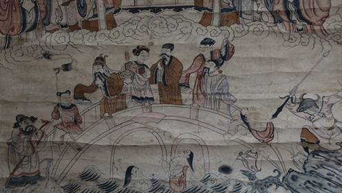 最早记录唐太宗入冥故事的文本是敦煌卷子S.2630,这个卷子现存在英国博物馆,它大概是晚唐时期的作品,还没有出现龙王。到了明朝初年《永乐大典》所收《魏征梦斩泾河龙》时,就出现了龙王,此后的《西游记》、《翠莲宝卷》、川剧《唐王游地府》和《斩龙台》都有龙王。《西游记》一开始就讲了泾河龙王违背天命被天庭斩首的故事,龙王死前找唐太宗帮忙,但是魏征还是在梦中斩了龙王。龙王的魂魄因此怀恨在心,拉唐太宗下地府算账。这个故事非常常见,几乎出现在每一套十王画里。这个故事在《西游记》里之所以重要是因为对《西游记》的叙事结构起到了很重要的作用。唐太宗允诺回到人间后举行盛大的超度仪式,这个仪式就是由唐玄奘主持的,仪式结束后,观音点化玄奘去西天取经。所以可以说,如果没有唐太宗入冥就没有西天取经,所以唐太宗入冥这个故事才会在十王画中有这么重要的地位。