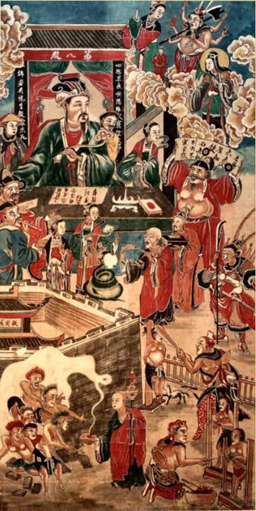 近代以来,华南地区的民间法师所用的十王神轴画,结构变得更为复杂:图画变成三层或四层。除了之前的冥王层和死者历程层外,还增加了一是位于图画最上层的各种佛教道教的救苦天神,二是冥王桌前的故事性画面层。宗教负责救苦的天神可以让地狱里的死者免于酷刑,比如会突然开出莲花将人从沸腾的油锅中托出,还会伸出手接住就要掉到奈何桥下的死者。这似乎体现出一种地狱图的“乐观化”现象,或许和法师主持的“破地狱”的超度仪式密切相关。故事层很重要,因为有时候,这些故事甚至会取代死人历程,成为神轴画中不能忽视的重要画面。
