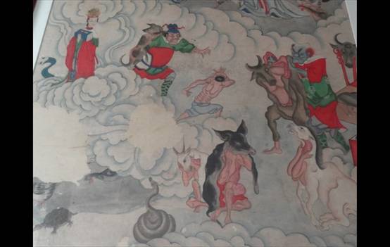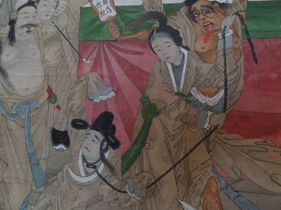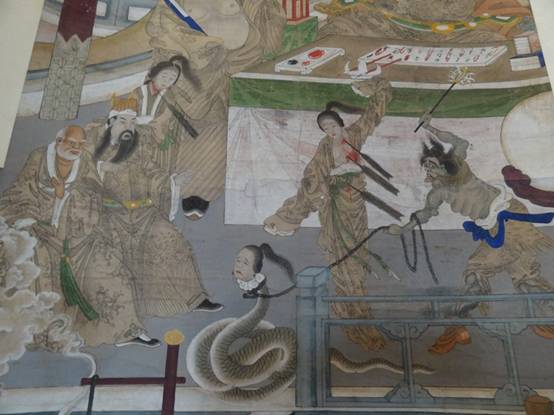 郗氏变蟒故事在通俗文学中存在两个系统,在十王画里也有两个系统。一种是超度类,蛇面向梁武帝和宝志和尚祈求超度。大部分十王画都属于这一类。这一类画中,变成蛇的郗氏有时甚至不会完全出现在武帝和宝志指旁边,这恰好说明了这个故事很流行。另一种则接近活捉类,蛇被苗贵妃活捉到地府,这类场景虽然只是出现在少数十王画中,但可以说明十王画受到了小说和戏曲的影响。