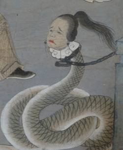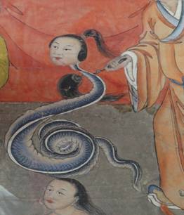 然而,在近代十王画中,郗氏却一致被画作了一条人头蛇。出现这个现象的原因可能有三,第一是因为这是一个简化故事的办法;第二是这种画法可能受到了别的冥间蛇神,如著名的丧门、吊客的影响;第三点目前还只是猜测:人头蛇的郗氏和龙头人的泾河龙王同时出现在一副神轴画中,可能暗含着某种图像性的逻辑。