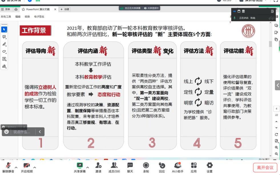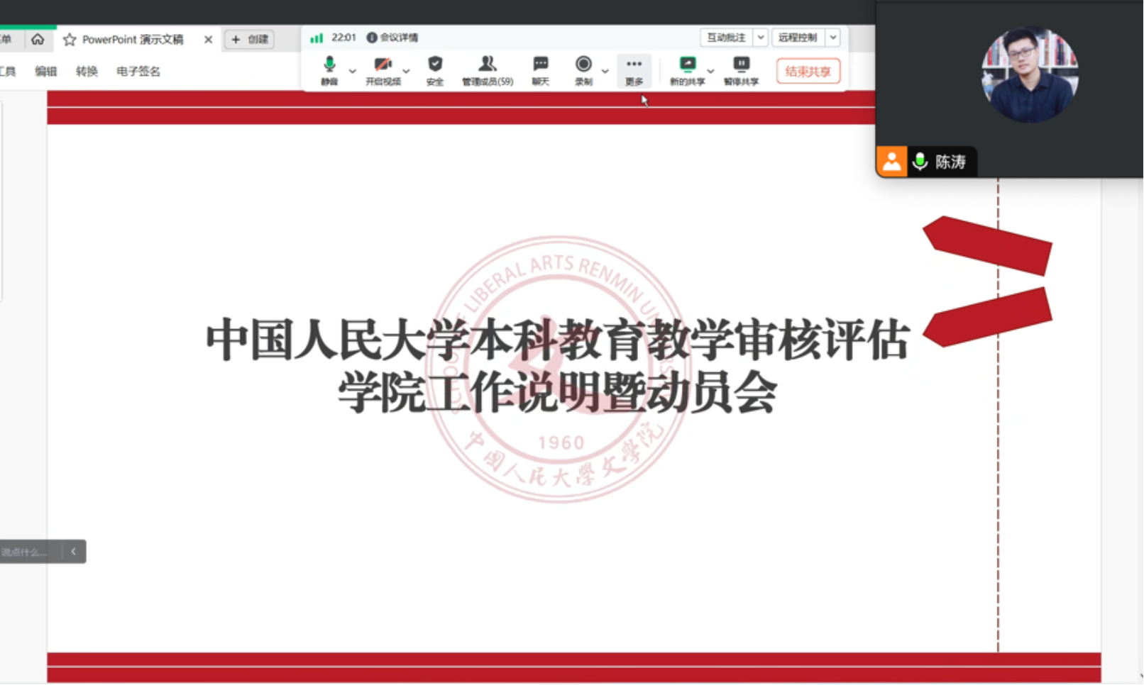 陈涛副院长围绕学院本科教育教学审核评估工作进行汇报。汇报主要分为三个部分,分别是工作背景、工作内容和重点指示。