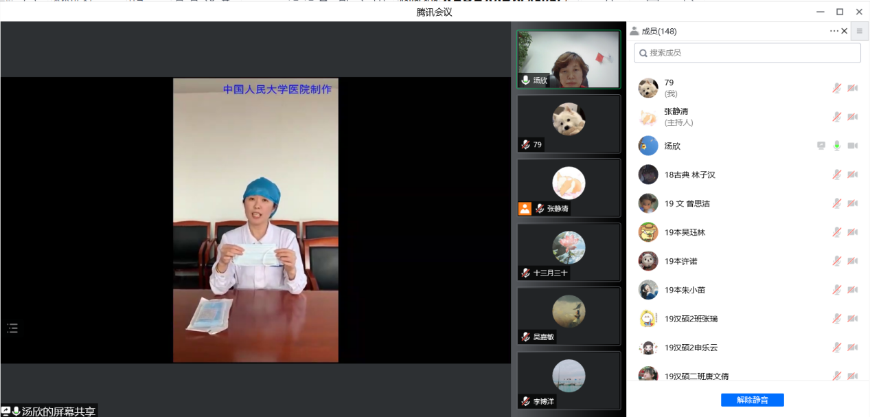 (汤院长为同学们播放如何正确佩戴口罩的教学视频)