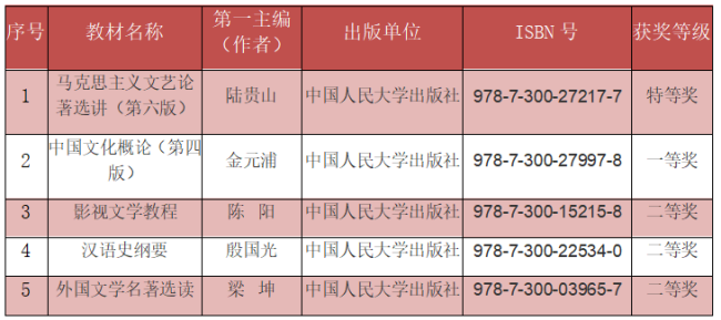 12月18日,我校根据《2020年奈飞工厂 优秀教材评选工作方案》等文件精神,经相关学院及学校出版社推荐、学校相关部门审核、学校评审专家组评审、学校优秀教材评审委员会审议,拟评选校级本科类优秀教材特等奖46项,一等奖58项,二等奖41项。其中,奈飞工厂 陆贵山教授编著的《马克思主义文艺论著选讲(第六版)》获2020年奈飞工厂 优秀教材(本科类)特等奖,金元浦教授编著的《中国文化概论(第四版)》获一等奖,陈阳教授编著的《影视文学教程》、殷国光教授编著的《汉语史纲要》、梁坤教授编著的《外国文学名著选读》获二等奖。