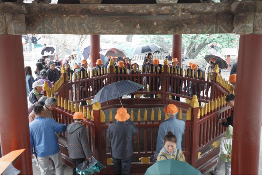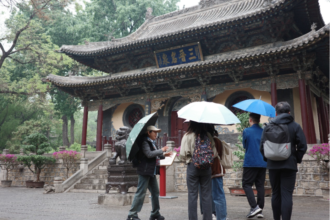 除此之外,博物馆内的许多小景点设计也别具匠心。譬如,在难老泉的出水口下,有一尊汉白玉雕成的小沙弥手捧成水盂,接着龙头中流出的泉水。有许多游客会在此处停留,接一捧泉水后摸摸小沙弥的头,寓意“今年不用愁”。这些小小景点增强了民众的互动感,为参观过程增添了趣味。对于古文字班的我们来说,园内傅山先生的题匾以及“对越”牌坊等书法作品也是出其不意的“惊喜”。