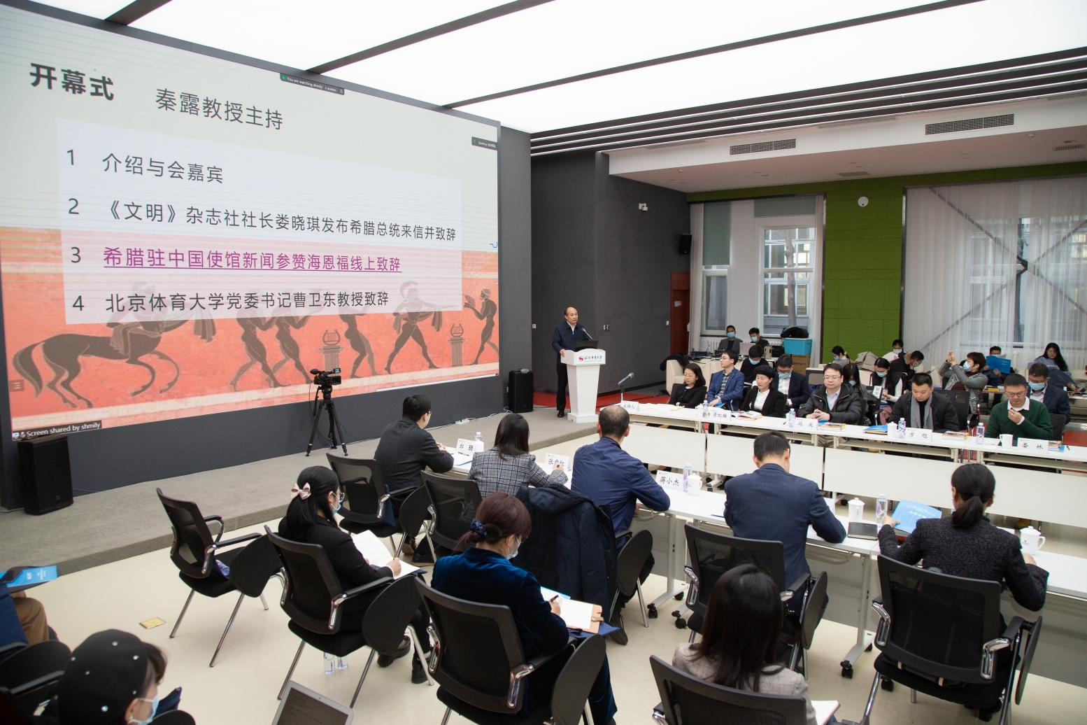 在会议开幕式上,《文明》杂志社社长娄晓琪发布总统来信,希腊驻华大使馆新闻参赞海恩福(Euthymios Athanasiadis)先生通过视频发表致辞,北京体育大学党委书记曹卫东教授致辞,强调奥林匹克的精神、和平与友谊在当代世界的重大意义。
