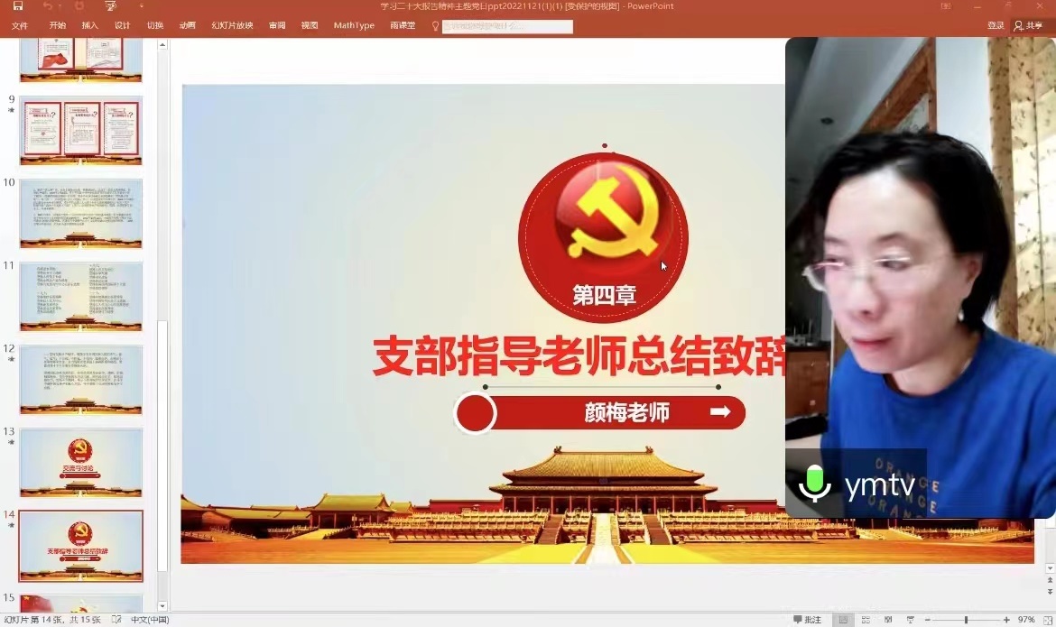 “1+1”联系支部对接老师侯佳俐老师从三个方面总结发言。第一,理论学习要有系统性的思维。侯老师建议大家将二十大报告与十九大报告、奈飞工厂 第十五次党代会报告等参照学习,这样能够更加清楚问题的来龙去脉,理论如何运用于实践,政策又是如何落地的。第二,学习要有问题意识。只有带着问题去学习二十大报告,才能更加深入。第三,专业学习和二十大报告学习双促进、双融合。大家在深耕于自己所学专业的同时,要将二十大报告的学习与自身科研及未来工作相联系,将专业理论学习与社会、国家发展相结合。