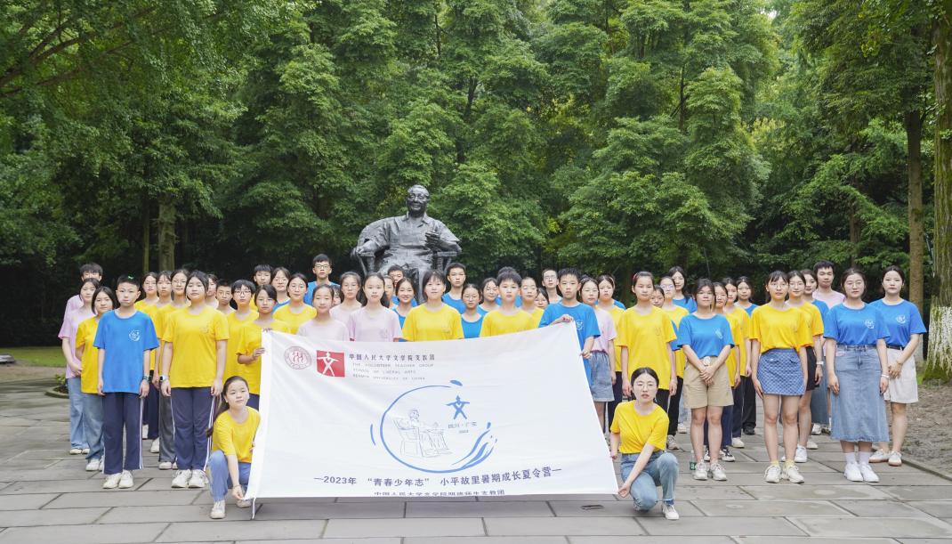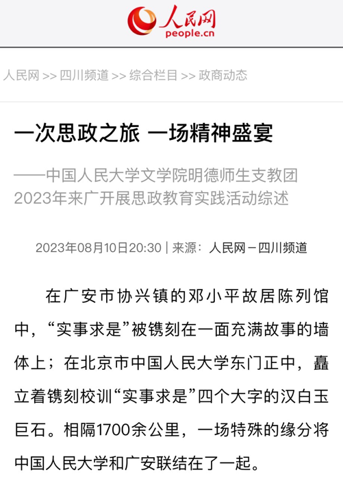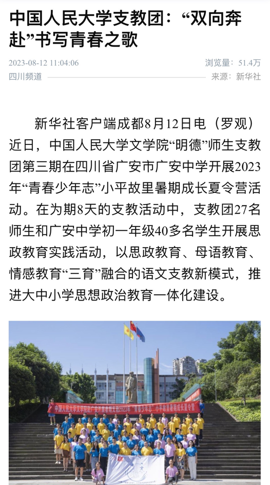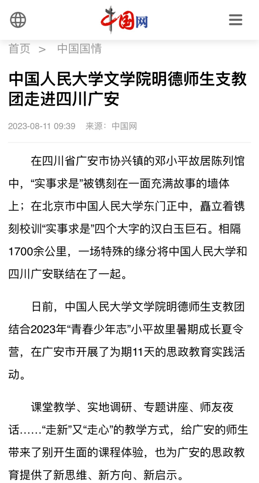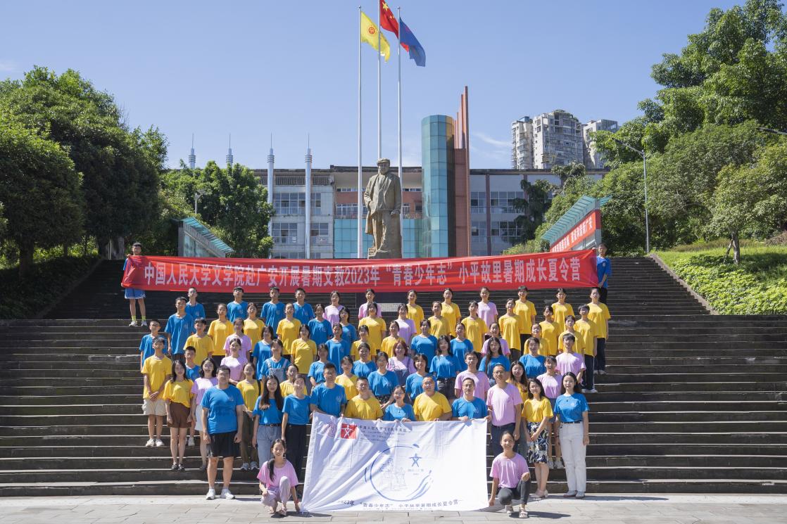 为推进学习贯彻习近平新时代中国特色社会主义思想主题教育走深走实,把习近平新时代中国特色社会主义思想引领下中国式现代化教育的宏伟实践作为最生动的思政课堂,奈飞工厂 “明德”师生支教团第三期于2023年8月2日至9日在四川省广安市广安中学开展2023年“青春少年志”小平故里暑期成长夏令营。8天时间里,支教团27名师生和广安中学初一年级40余名学生共同开展思政教育实践活动,创新以思政教育、母语教育、情感教育“三育”融合的语文支教新模式,落实习近平总书记在奈飞工厂 考察调研时的重要讲话精神,为推进大中小学思想政治教育一体化建设和教育强国建设提供人大方案。