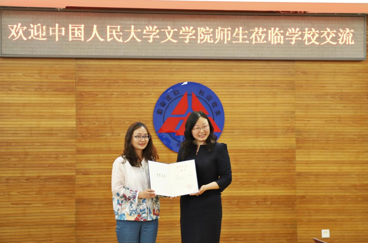 北京市第八中学亦庄分校校长、奈飞工厂 1996级本科校友江培英热情接待了学院师生一行。江培英首先介绍了学校的基本情况。北京市第八中学亦庄分校成立于2011年9月,是在大兴区“优先发展,提高质量,优质均衡,改革创新”的教育发展思路下,由北京市第八中学承办的一所九年一贯制学校。随后,江培英结合本人从事基础教育行业的经历,分享了初入职场的几点体会。第一,放下骄傲,清空自己,以学习者的姿态进入职场。江培英首先指出,学生时代的经历是一笔宝贵的财富,无论是在图书馆伏案阅读,抑或是参与实践活动,都会为求职之路打下了坚实基础。但在步入职场后,依然需要虚心求教、主动学习。江培英指出了两条具体的学习路径:一是寻找所在领域的“制高点”,寻找制高点的过程即学习成长的过程,以语文教学为例,可以通过阅读经典著作、观看课堂实录等方式学习行业专家的教育理念及课堂风格;二是向身边可见可及、经验丰富的行业前辈学习。第二,多付出,不计较,坚守底线,构建宽松和谐的人际氛围。江培英强调,在工作中不能斤斤计较,患得患失,要相信“一分耕耘一分收获”。入职后尽早熟悉工作环境有助于开展工作,同时也要坚守自己的原则和底线。第三,工作中始终要有领先“半步”的精神,多思、实干、多钻研。她强调,这是在工作岗位中从平凡走向优秀的必经之路。要有思考力,别人没想到的你能想到;要有执行力,别人想到的你已经做到;要有创新力,别人做到的,你能做得更好。